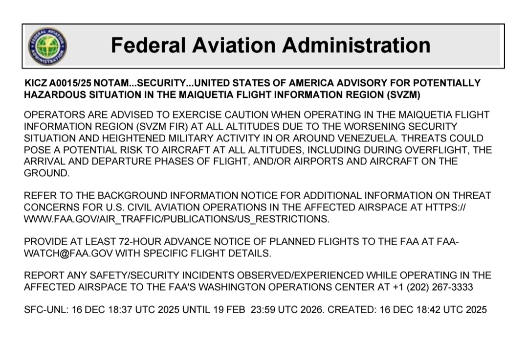 La medida, anunciada por la Administración Federal de Aviación (FAA, por sus siglas en inglés), refleja la creciente preocupación por los riesgos que enfrentan las aeronaves civiles en sobrevuelo, llegada, salida y operaciones en tierra dentro de Venezuela.