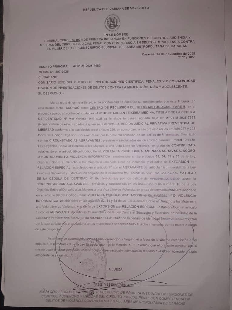 El actor y animador venezolano Anthony Texeira fue formalmente privado de libertad y enviado al internado judicial Yare II este jueves, tras ser capturado por el Cuerpo de Investigaciones Científicas, Penales y Criminalísticas (CICPC) la noche del martes 11 de noviembre de 2025.