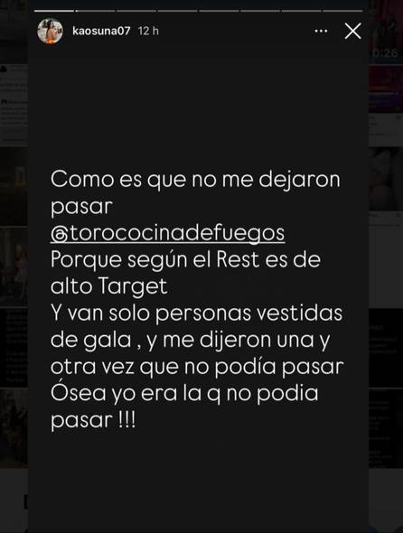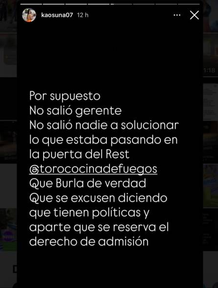 «No salió nadie a solucionar lo que estaba pasando en la puerta del Rest. Qué burla de verdad, que se excusen diciendo que tienen políticas y aparte que se reserva el derecho de admisión», apuntó en las historias de Instagram.