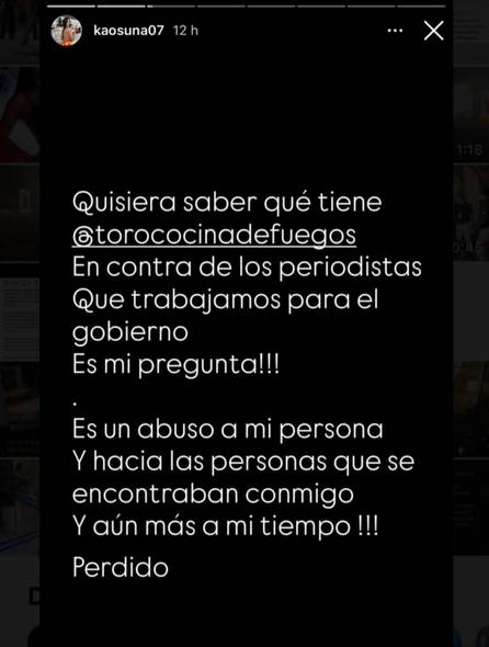 «Quisiera saber qué tiene @torococinadefuegos en contra de los periodistas que trabajamos para el gobierno. Es mi pregunta», aseveró. «Es un abuso a mi personas y hacia las personas que se encontraban conmigo y aún más a mi tiempo perdido», añadió.