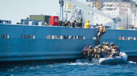 De acuerdo con la publicación, los marines estadounidenses ejecutan maniobras tácticas desde embarcaciones rápidas hacia buques de gran porte, simulando abordajes, aseguramiento de cubiertas y control de naves en movimiento.