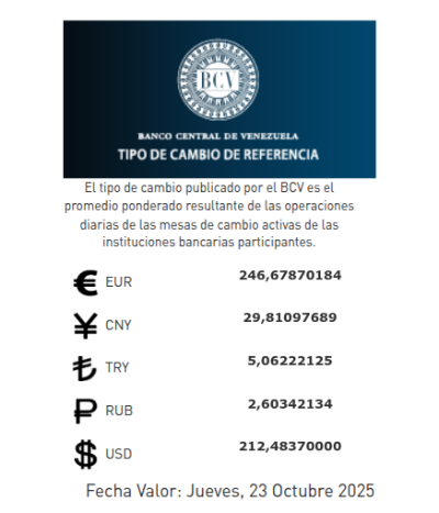 De acuerdo con la información indicada por el Banco Central de Venezuela al cierre de este miércoles 22 de octubre, el dólar se cotizará en 212,48 bolívares con fecha valor jueves 23 de octubre de 2025.