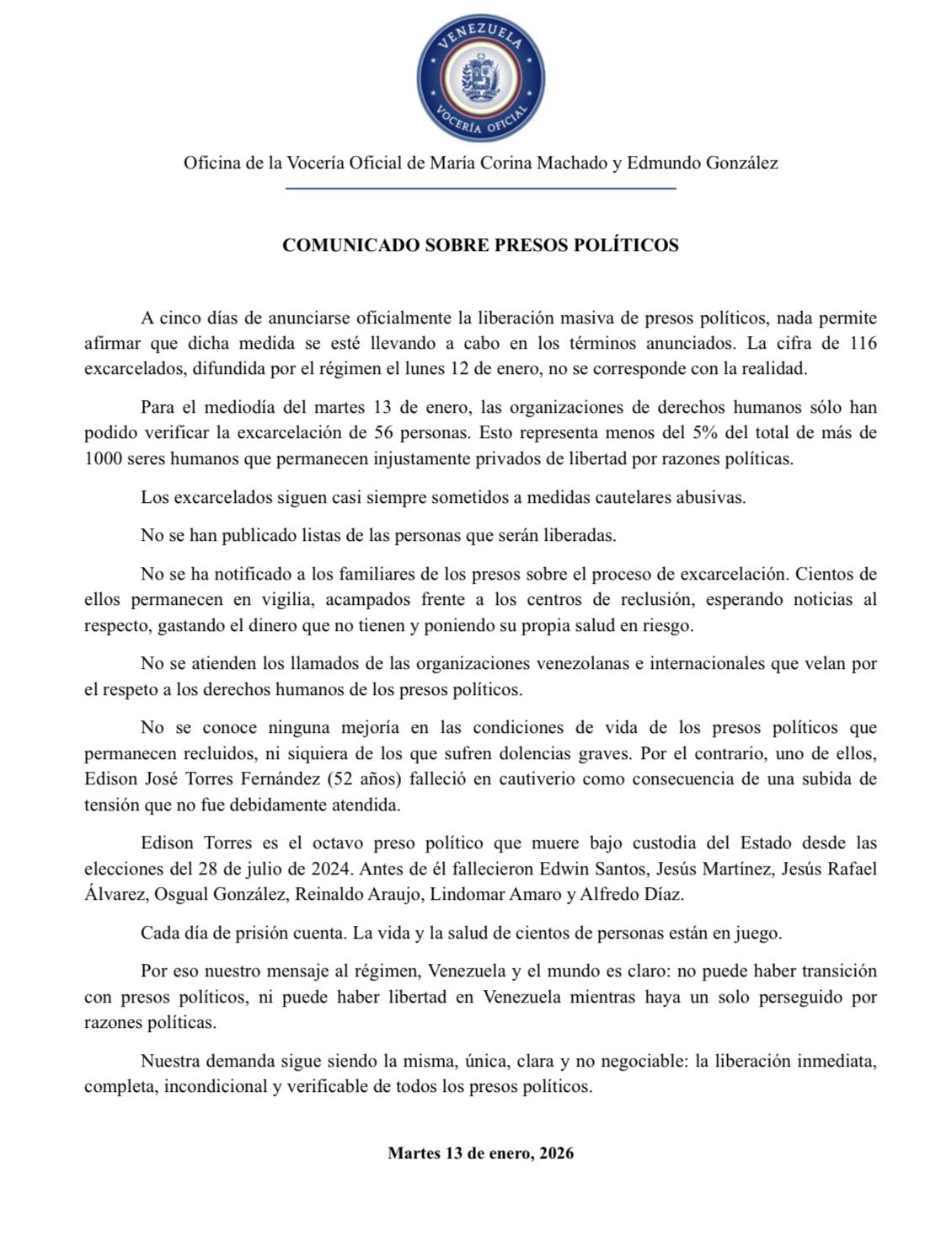 Para el mediodía del martes, 13 de enero, las organizaciones de derechos humanos solo han podido verificar la excarcelación de 56 personas. Esto representa menos del 5% del total de más de 1000 seres humanos que permanecen injustamente privados de libertad por razones políticas», expresaron.Asimismo, Edmundo González Urrutia y María Corina Machado comentaron que los excarcelados «siguen casi siempre sometidos a medidas cautelares abusivas».