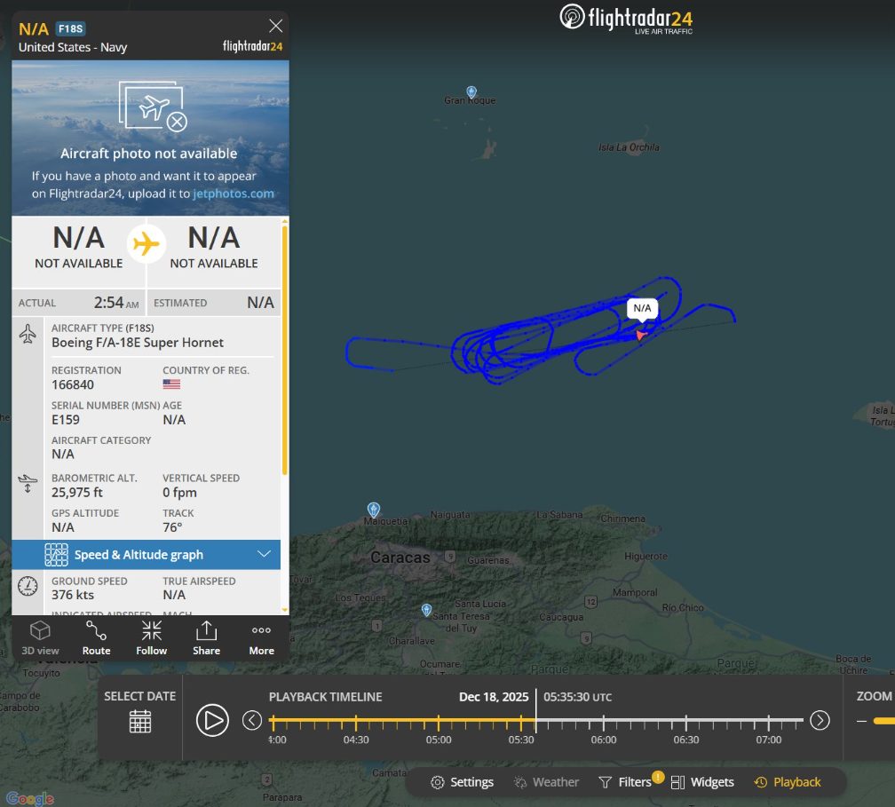 De acuerdo con datos del monitor digital FlightRadar24, el avión de combate adscrito al portaaviones USS Gerald R. Ford (CVN-78) dio innumerables vueltas con su transpondedor encendido frente a las costas de Caracas y los estados Vargas y Miranda.