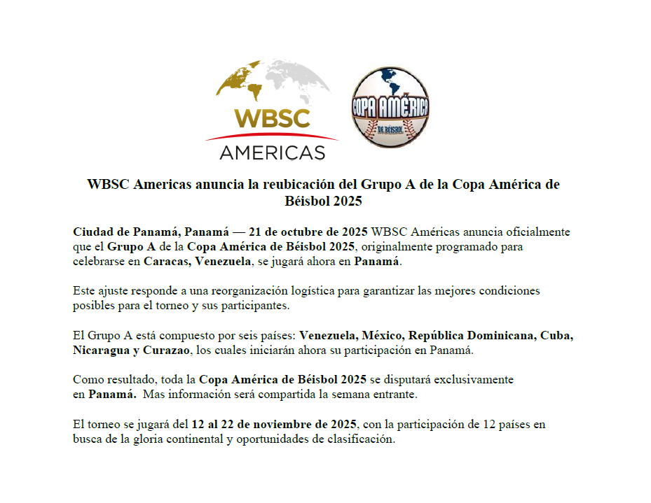 «WBSC Américas anuncia oficialmente que el Grupo A de la Copa América de Béisbol 2025, originalmente programado para celebrarse en Caracas, Venezuela, se jugará ahora en Panamá», indicó el organismo en un comunicado.