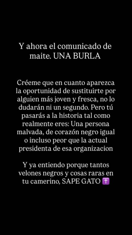“Créenme que en cuanto aparezca la oportunidad de sustituirte por alguien más joven lo harán, no lo dudes ni un segundo. Eres una persona malvada, de corazón negro igual o incluso que peor, que la presidenta de Miss Venezuela. Ya entiendo tantos velones negros y cosas raras en tu camerino”, escribió en sus historias.