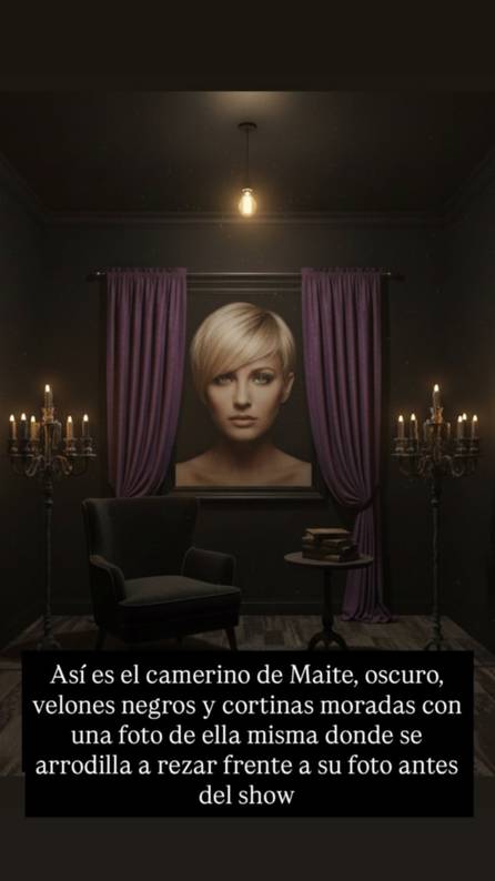 “Es oscuro y cortinas moradas con una foto de ella misma, donde se arrodilla a rezar frente a su foto antes del show”, escribió.