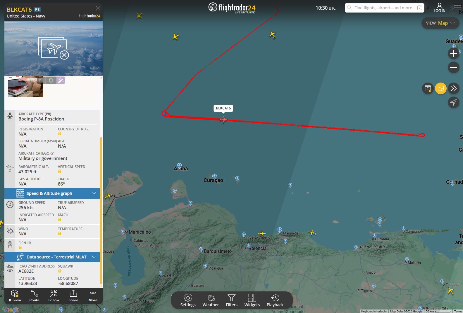 Según datos del monitor digital FlightRadar24, el misterioso aparato con toda probabilidad despegó desde la Base Aérea de Jacksonville, en Florida, Estados Unidos, y luego se dirigió hasta el mar Caribe, donde realizó varios giros de reconocimiento.