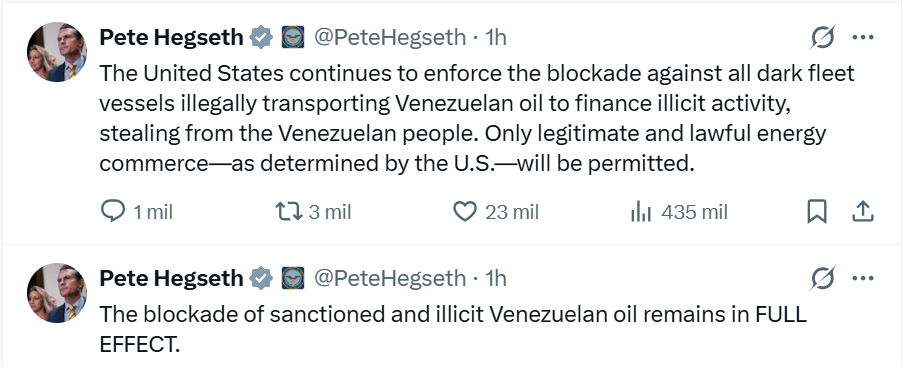 El secretario de guerra de Estados Unidos, Pete Hegseth, señaló este miércoles que el gobierno de Donald Trump seguirá con el bloqueo a busques que transporten ilegalmente el petróleo de Venezuela.