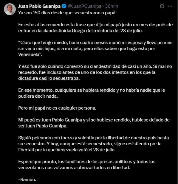 “Ya son 150 días desde que secuestraron a papá. En estos días recuerdo esta frase que dijo mi papá justo un mes después de entrar en la clandestinidad luego de la victoria del 28 de julio: ‘Claro que tengo miedo, hace cuatro meses murió mi esposa y llevo un mes sin ver a mis hijos, ni a mi nieta, pero ellos saben que hago esto por Venezuela’”, escribió Ramón.