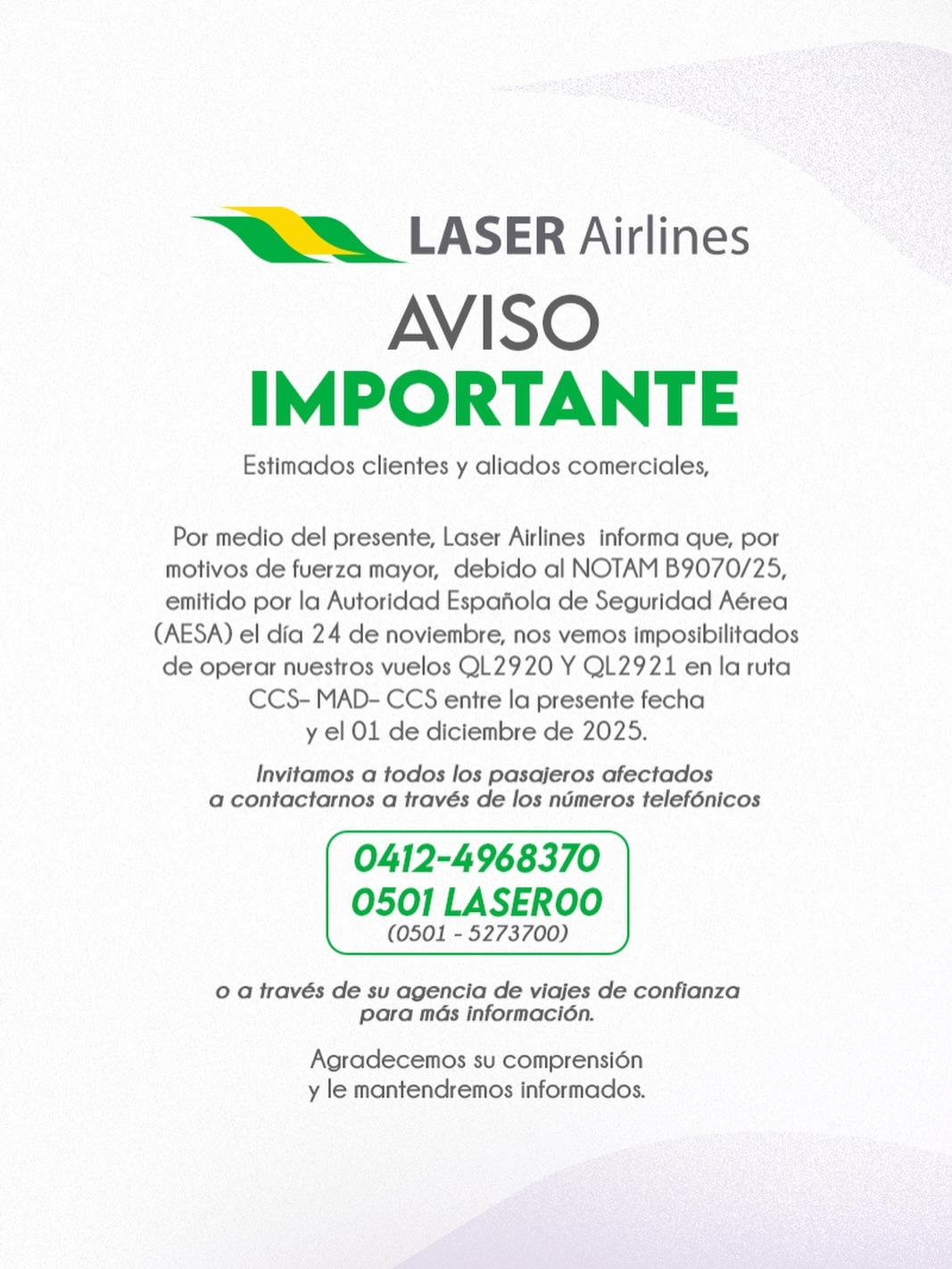 España recomendó no viajar a Venezuela: Aerolínea Laser suspendió sus vuelos a Madrid hasta el 1Dic