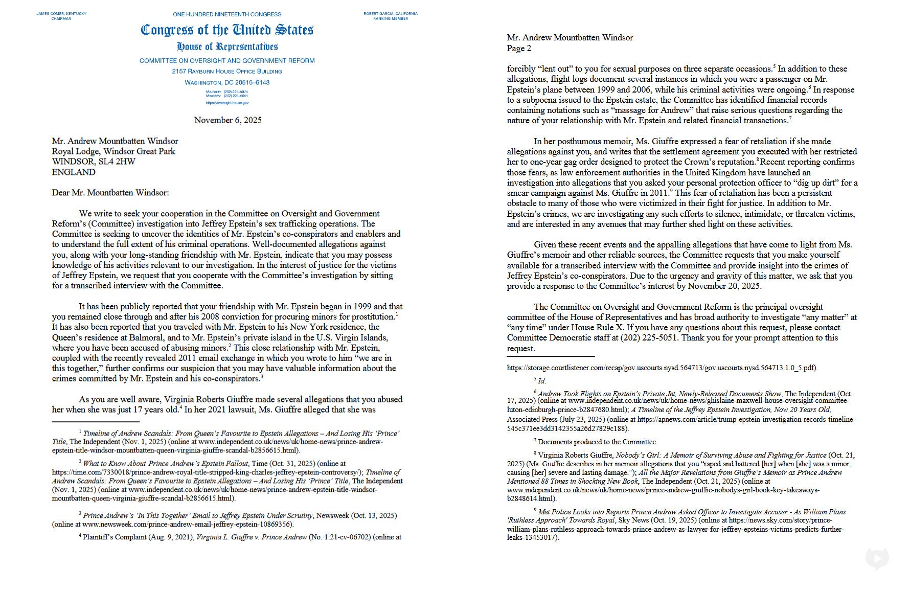 El Congreso de Estados Unidos solicitó formalmente al expríncipe Andrés, ahora conocido como Andrés Mountbatten Windsor, que se someta a una entrevista transcrita ante el Comité de Supervisión de la Cámara de Representantes.