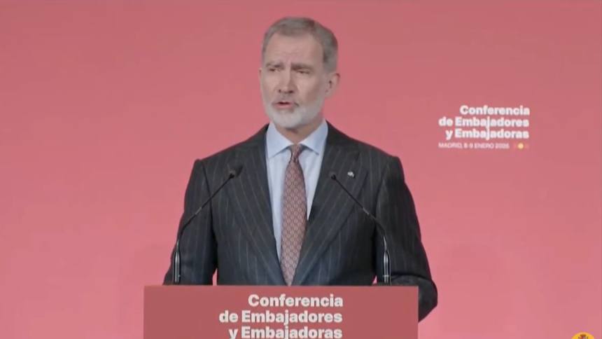 Felipe VI subrayó que la «seguridad global está en peligro», como se ha podido ver en Palestina, Ucrania y otros países, y pidió a los representantes diplomáticos que sigan defendiendo el derecho internacional, al que se refirió como el «faro ético» del que se ha dotado la comunidad internacional para asegurar una convivencia pacífica y próspera.