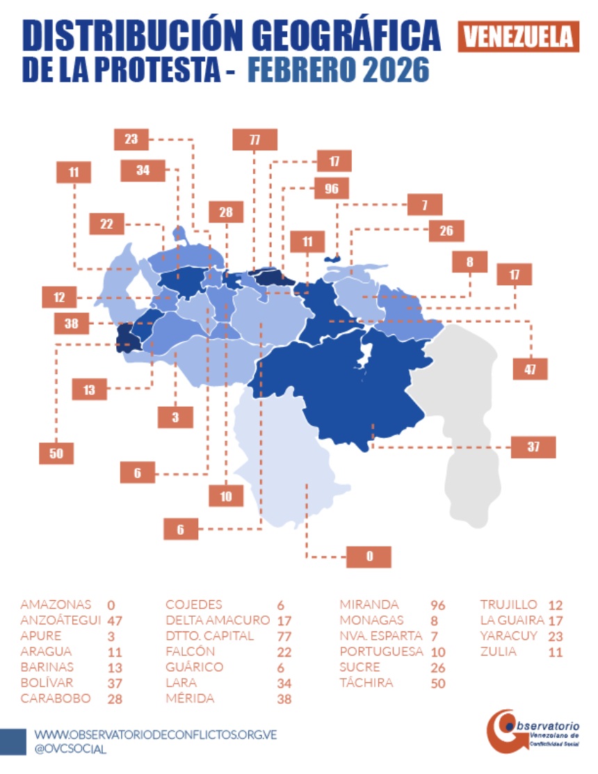 Venezuela registró 599 protestas, en su mayoría por derechos civiles y la liberación de presos políticos, durante febrero, de acuerdo al último informe del Observatorio Venezolano de Conflictividad Social (OVCS).