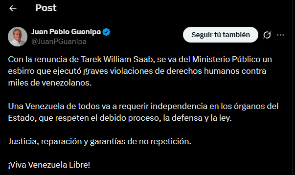 El dirigente opositor venezolano, Juan Pablo Guanipa, publicó un contundente mensaje en su cuenta oficial de X, tras la renuncia este miércoles 25 de febrero de Tarek William Saab como Fiscal General, una de las figuras más controvertidas del régimen chavista en los últimos años.