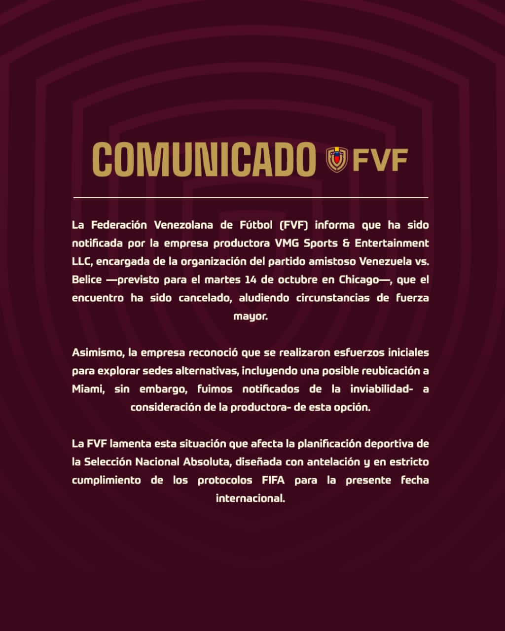 La Federación Venezolana de Fútbol (FVF) anunció este sábado la suspensión del partido amistoso que la Vinotinto disputaría con Belice en la ciudad de Chicago, Estados Unidos (EEUU), «por circunstancias de fuerza mayor».