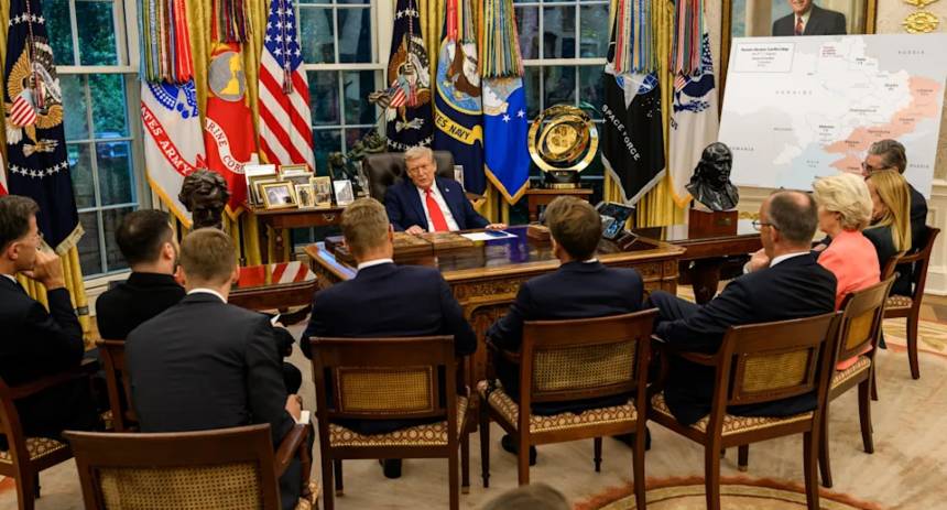 La fotografía real se tomó en agosto y aparecen en ella los principales líderes de la Unión Europea (UE), además con el secretario general de la OTAN, Mark Rutte, y el primer ministro británico, Keir Stamer.