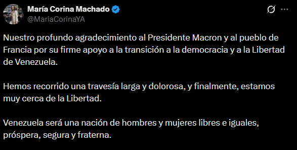 «Nuestro profundo agradecimiento al presidente Macron y al pueblo de Francia por su firme apoyo a la transición a la democracia y a la libertad de Venezuela», expresó Machado. De igual manera, la Premio Nobel de la Paz resaltó el esfuerzo civil para alcanzar una transformación institucional pacífica en el país.