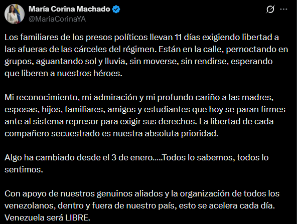La líder de la oposición democrática venezolana, María Corina Machado, envió este domingo un mensaje de respaldo a los familiares de los presos políticos que cumplen 11 días de protesta continua a las puertas de los centros de reclusión. A través de su cuenta en la red social X, la dirigente aseguró que la dinámica política del país se transformó irreversiblemente tras los sucesos de principios de mes.