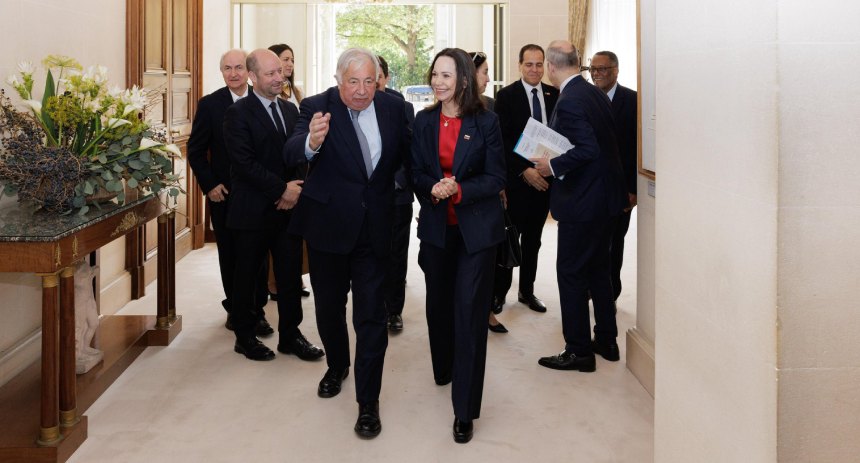 La líder de la oposición venezolana y Premio Nobel de la Paz, María Corina Machado se reunió con el presidente del Senado de Francia, Gérard Larcher, con quien abordó temas como la transición en Venezuela y la necesidad de establecer un cronograma electoral antes de que finalice el año.