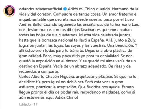 “Adiós mi chino querido. Hermano de la vida y del corazón. Compadre de tantas cosas. Un amor fraterno e inquebrantable que decretamos desde nuestro paso por el Liceo Andrés Bello. Cuando siguiendo las enseñanzas de tu hermano Luis, nos deslumbrabas con tus dibujos fascinantes que enmarcaban todas las hojas”, dice el doloroso escrito.