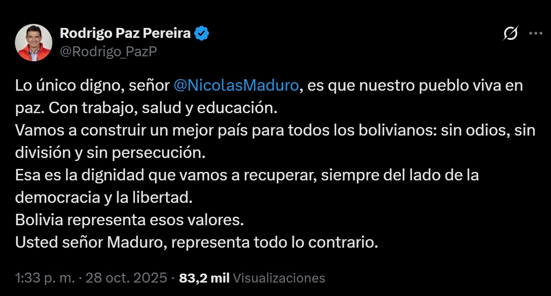 Paz, que ganó la segunda vuelta presidencial con el 54,9% de los votos, usó su cuenta de X (Twitter) para dirigirse a Maduro. Desde un principio, dejó claro que Bolivia buscará «recuperar la dignidad» durante su gobierno.