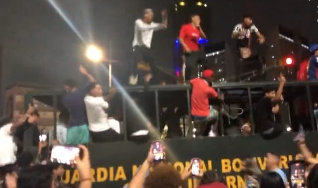 En un video que volvió viral en redes sociales, se observa a un grupo de fanáticos aprovechando la presencia de una jaula de la Guardia Nacional Bolivariana (GNB) para convertirla en una tarima improvisada de festejo