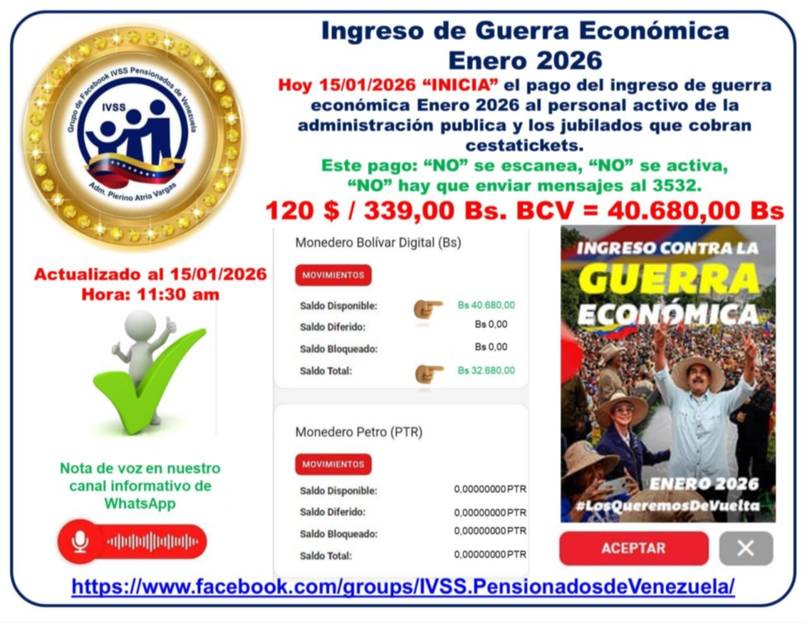 Este jueves, 15 de enero, inició el pago del Ingreso por Guerra Económica a través de la Plataforma Patria que beneficiará a todos los trabajadores públicos activos y jubilados que cobran cestatickets.