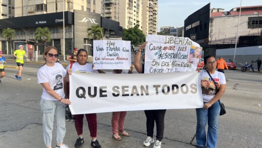 Familiares de presos políticos desplegaron pancartas este domingo 8 de febrero, durante el Maratón CAF que se llevó a cabo en Caracas, para exigir la liberación...