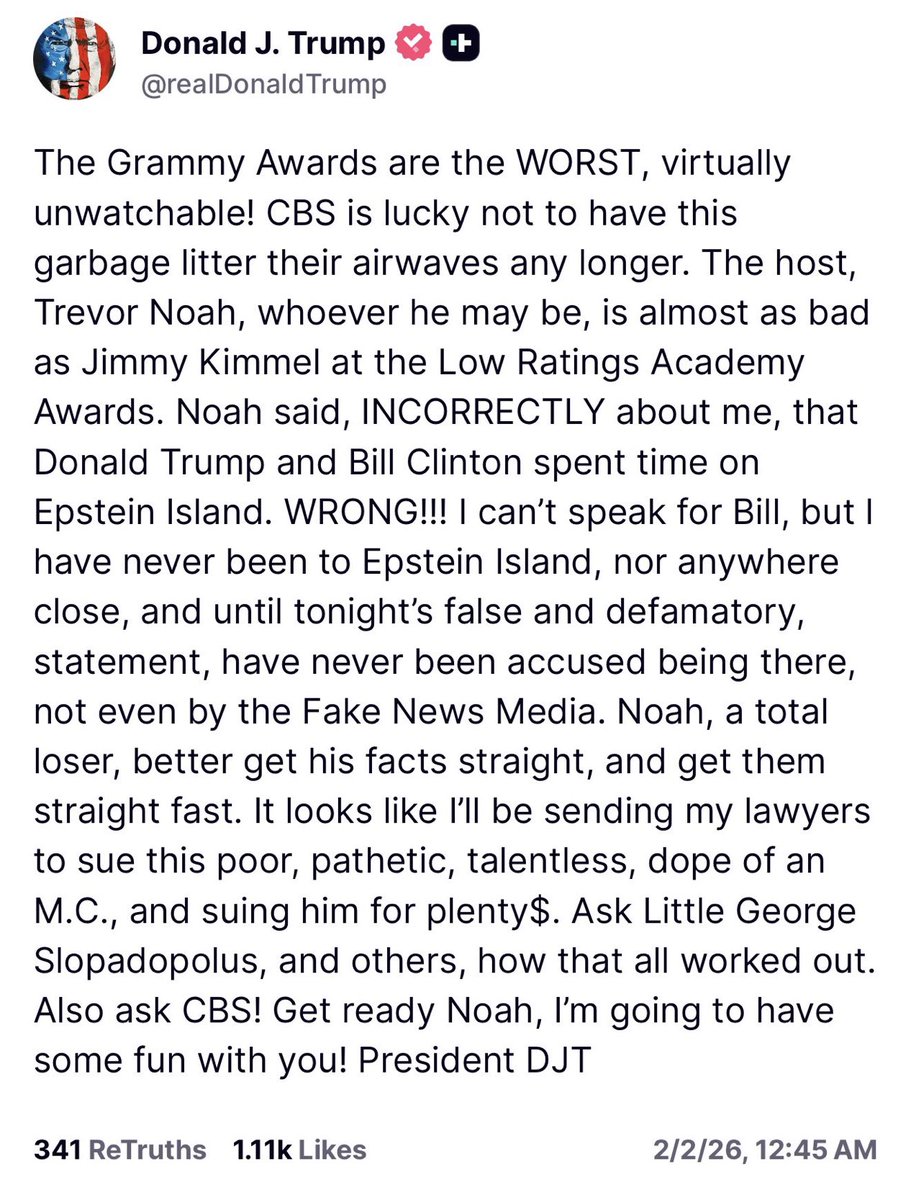 El presidente de EEUU, Donald Trump, ha amenazado con demandar a Trevor Noha, presentador de los Grammy, por decir que estuvo en la isla de Jeffrey Epstein: «Parece que voy a enviar a mis abogados a demandar a este pobre, patético, sin talento y tonto presentador», ha dicho en la red social Truth.