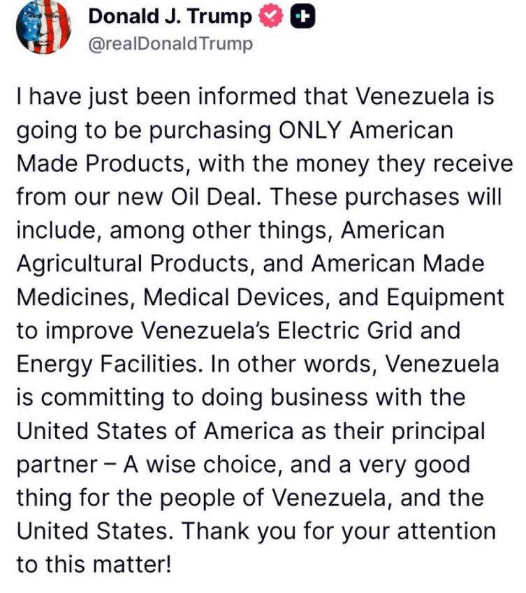 “Me acaban de informar que Venezuela comprará exclusivamente productos fabricados en Estados Unidos con el dinero que reciba de nuestro nuevo Acuerdo Petrolero», comunicó Trump a través de las redes sociales.