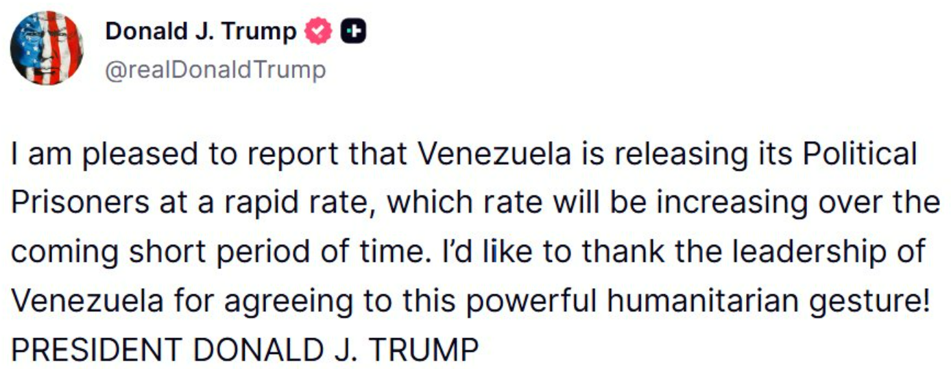 «Me complace informar que Venezuela está liberando a sus presos políticos a un ritmo acelerado, y se prevé que este ritmo aumente en las próximas semanas», escribió Trump en su red social Truth Social.