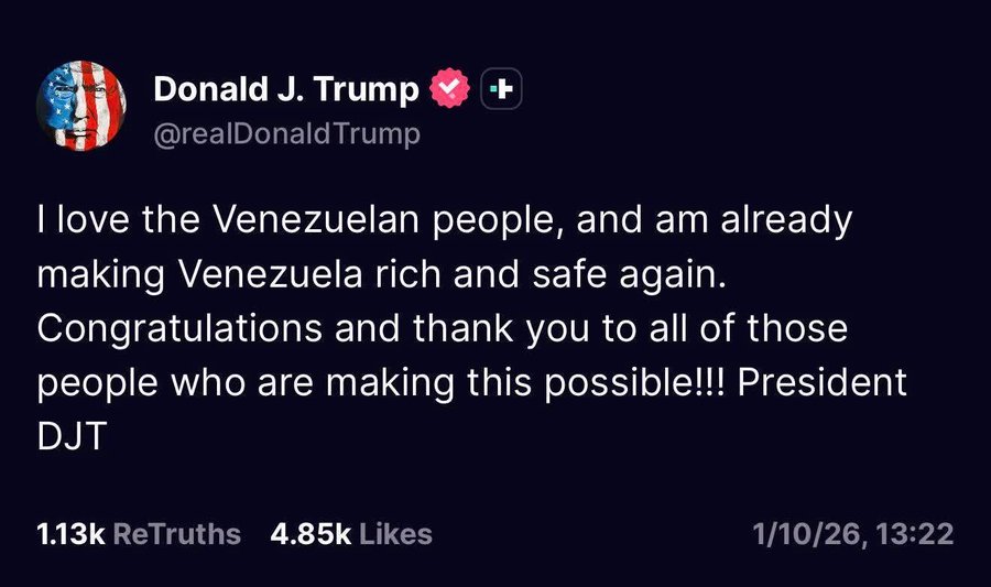 «Amo a los venezolanos, y ya estoy haciendo a Venezuela rica y segura otra vez. ¡Felicitaciones y gracias a todas las personas que están haciendo esto posible!», escribió el mandatario en su cuenta de la red social Truth.